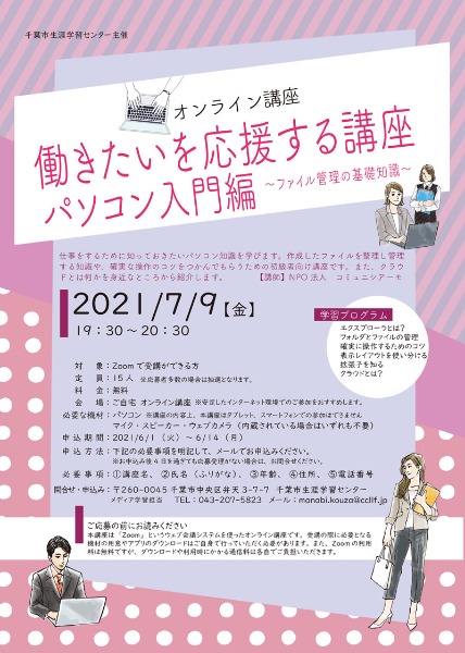 初心者がパソコンを使う仕事をするために必要な基本を学びます。作成したファイルの整理の仕方や管理の知識、効率よく操作するためのコツをつかんでもらうための講座です。また、クラウドとは何かを身近なところから紹介します。